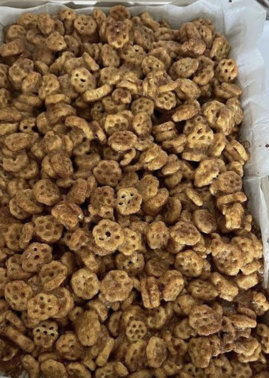 While the cereal bakes, mix the granulated sugar and cinnamon in a small bowl. As soon as the cereal comes out of the oven, sprinkle the cinnamon-sugar mixture over it and toss to coat evenly.